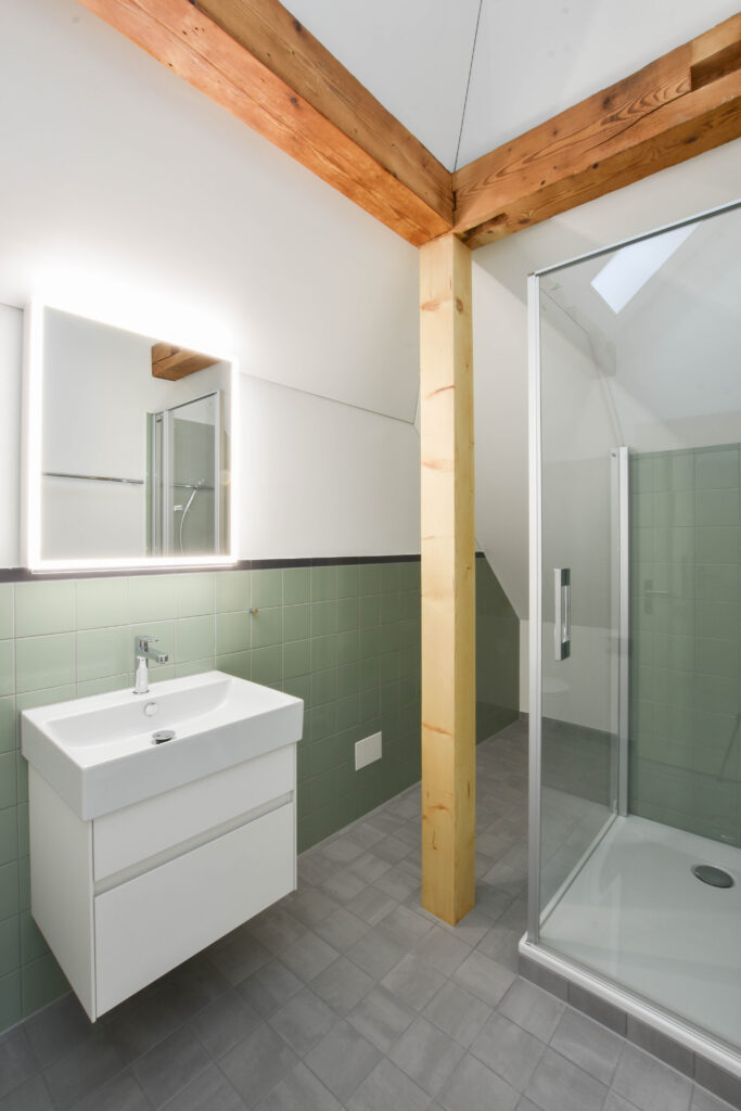 La configuration actuelle sera majoritairement conservée et en partie optimisée. Nous aurons à cœur de préserver le charme du bâti ancien, qui se reflétera dans les appartements. Ainsi par exemple, des parquets à bâtons rompus seront posés dans les pièces. Les douches seront équipées de parois en verre très pratiques. Des terrasses largement dimensionnées seront aménagées au 1er étage. Les combles seront transformés en deux studios de style moderne.