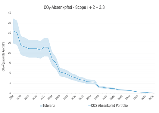 Im Jahr 2022 wurde der CO2-Absenkpfad für sämtliche Liegenschaften (Allein- und Miteigentum) aktualisiert, sowohl nach dem PACTA-Modell wie auch nach den Berechnungen von Wüest Partner. Während das PACTA-Modell nur die direkten Treibhausgas-(THG-)Emissionen für den Betrieb des Gebäudebestandes, insbesondere für die Wärmeerzeugung, misst (Scope 1), fliessen in die Berechnungen von Wüest Partner auch die indirekten THG-Emissionen, insbesondere für die Fernwärme und für den Strom der Wärmeerzeugung, sowie der Mieterstrom mit ein (Scope 2 und 3.3). (GHG Potocol: Scope 1, 2 und 3)