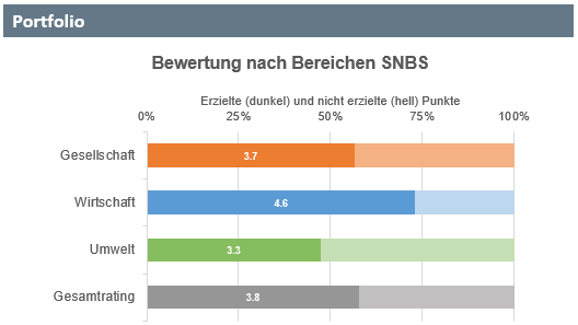 Im Jahr 2022 wurden alle Liegenschaften im Alleineigentum erstmals nach SNBS-Kriterien bewertet. Mit der für das Gesamtportfolio resultierenden Note von 3.8 bleibt eine Differenz auf die mittelfristig angestrebte Mindestnote von 4.0, welche dem Silber-Standard gemäss SNBS entspricht. Um die Entwicklung über den Zeitverlauf sichtbar zu machen und den Erfolg zu messen, unterziehen wir unsere Immobilienanlagen mindestens alle zwei Jahre einem SNBS-Rating.