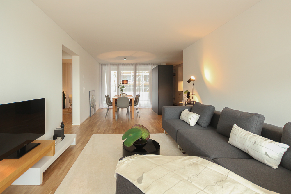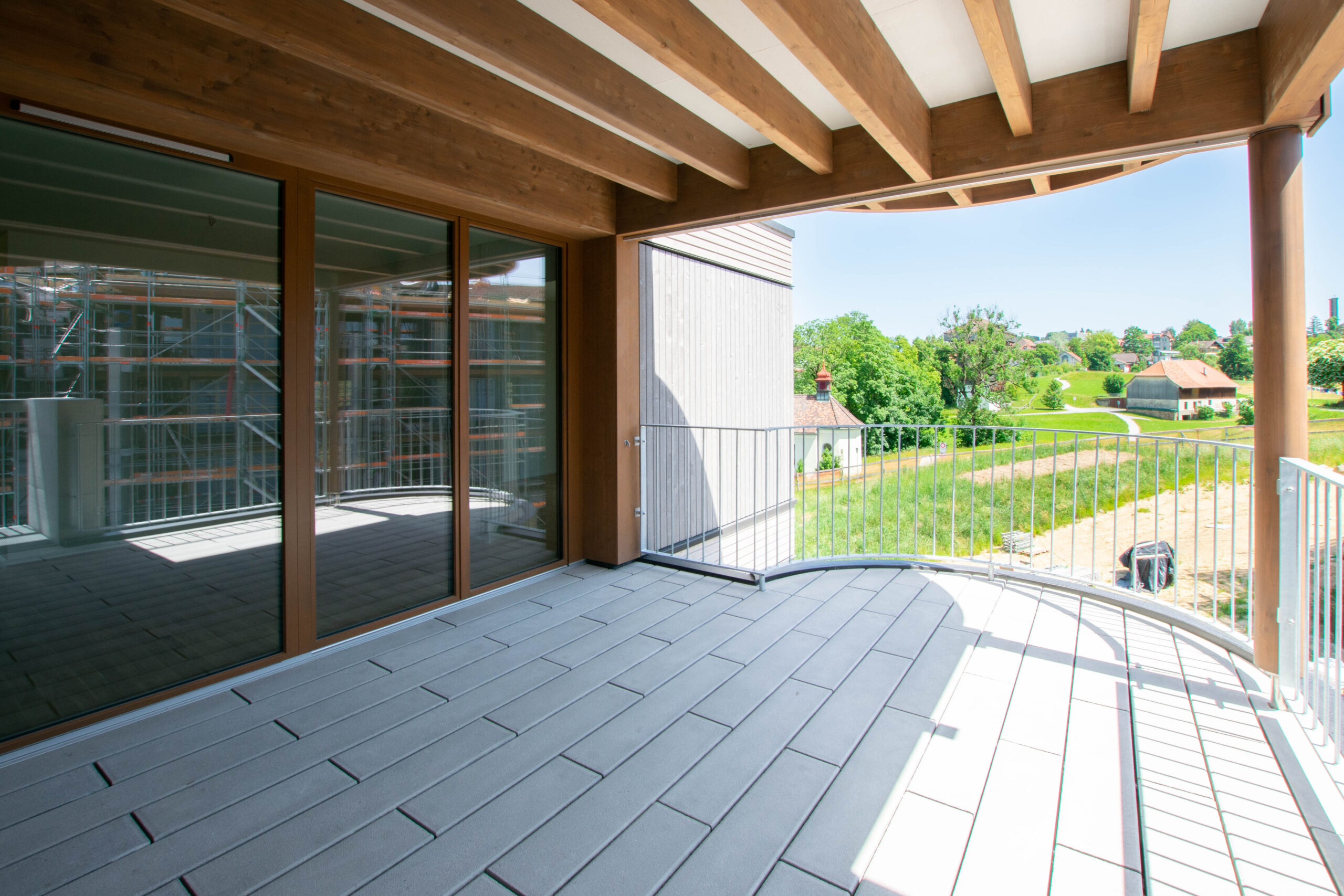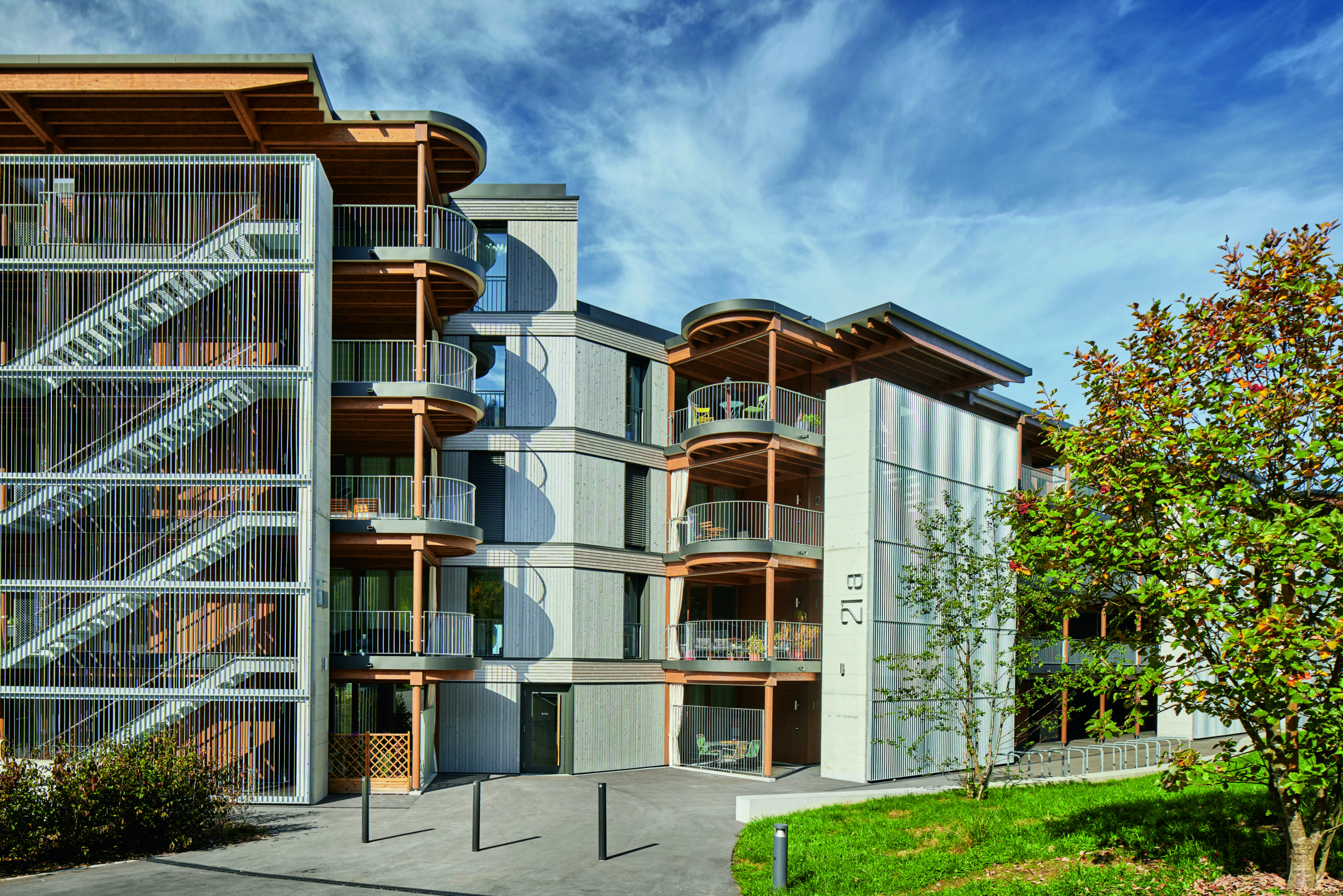 Als Baumaterial wurde vorwiegend Holz verwendet, und die Gebäude zeichnen sich durch eine hohe architektonische Qualität aus. Die Wohnungen verfügen über einen zeitgemässen Ausbaustandard. Die Parkplätze befinden sich in der unterirdischen Einstellhalle.